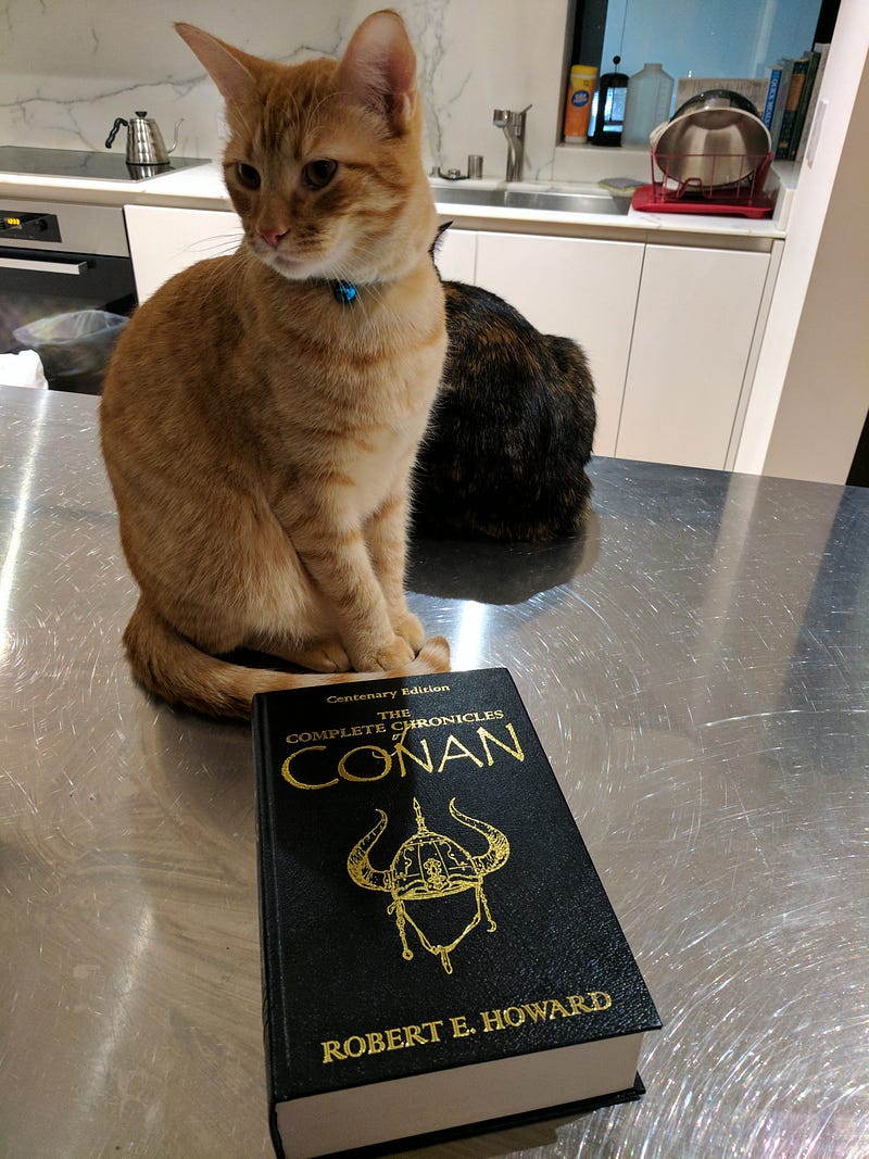There were 18 Conan short stories published during Howard’s lifetime, and three rejected (or unsubmitted) stories published after. He rewrote one of the rejected stories (“The Black Stranger”) into a different time period, with a different protagonist, and got it published in that form (as “Swords of the Red Brotherhood”). He wrote a single Conan novel called The Hour of the Dragon(referring to the banner of the Hyborian country of Nemedia, not an actual dragon). I read most of the Howard Conan corpus this month; I’m still finishing The Hour of the Dragon , and I still have to read “The Black Stranger,” because the collection I have on my Kindle skipped the unpublished stories.