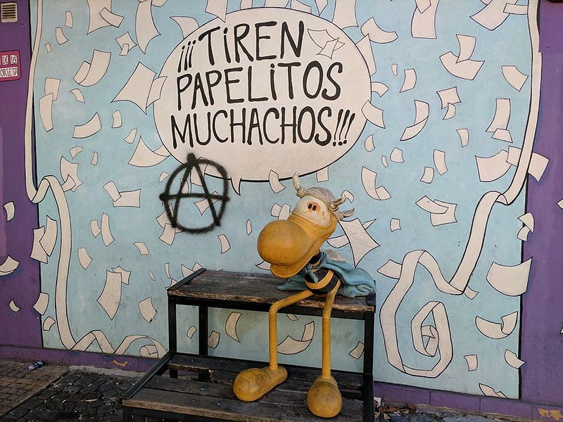 I got to Buenos Aires on a Sunday morning. I left my bag at the hotel and wandered into town, tired, crabby, hungry, grubby, unable to nap or shower, with six hours to kill. The street next to the hotel had been turned into a market — it would later become clear this happened every Sunday — which might have been fun if I had been awake and were the sort of person who enjoyed looking at objects and thinking about how it might be fun to buy them, but in my state of exhaustion what I mostly noticed was that the booths made it impossible to walk on the sidewalk, and the street was uneven cobblestones that hurt my feet, even more so because I had to get around the crowds standing in my way. I found some sunblock and sprayed it over myself, making me less worried that I’d get burned but increasing the feeling of being oily and dirty. Google Maps gave me long lists of closed restaurants; I eventually found an outdoor cafe and ordered something unsatisfying with a liter of beer.