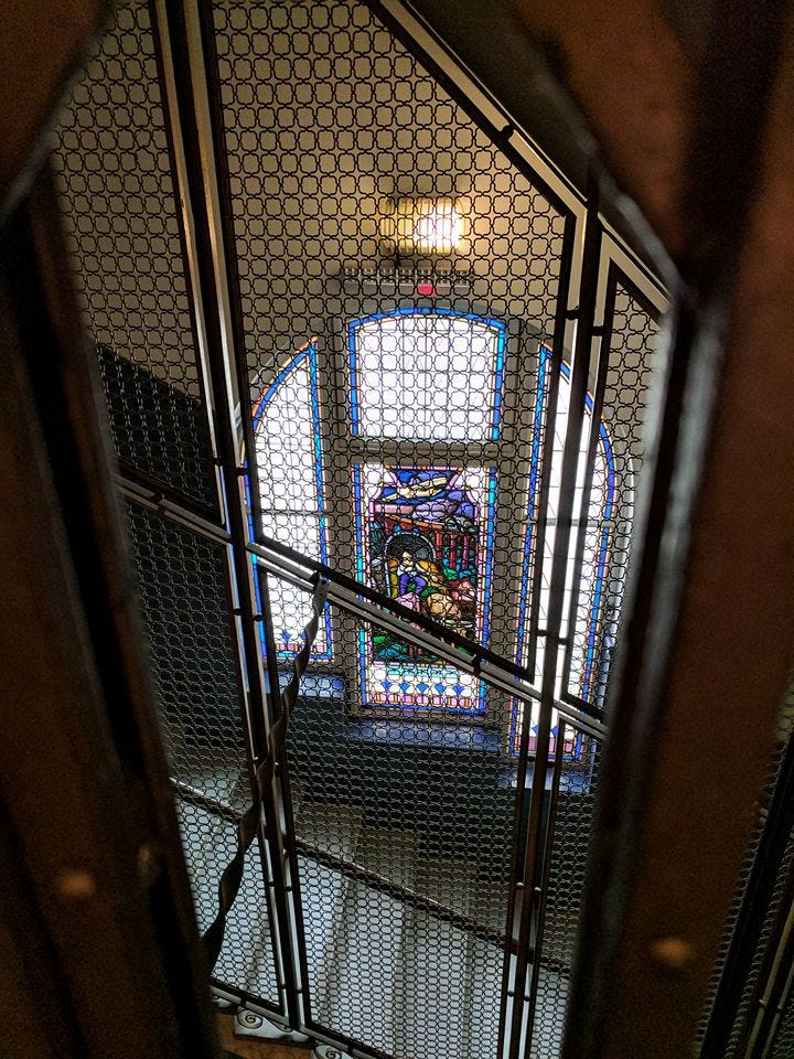 Stained glass window visible through the elevator cage; the elevator had manual doors, and when you closed them it took off like a rocket.