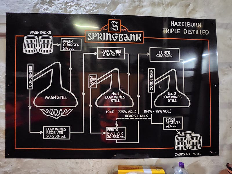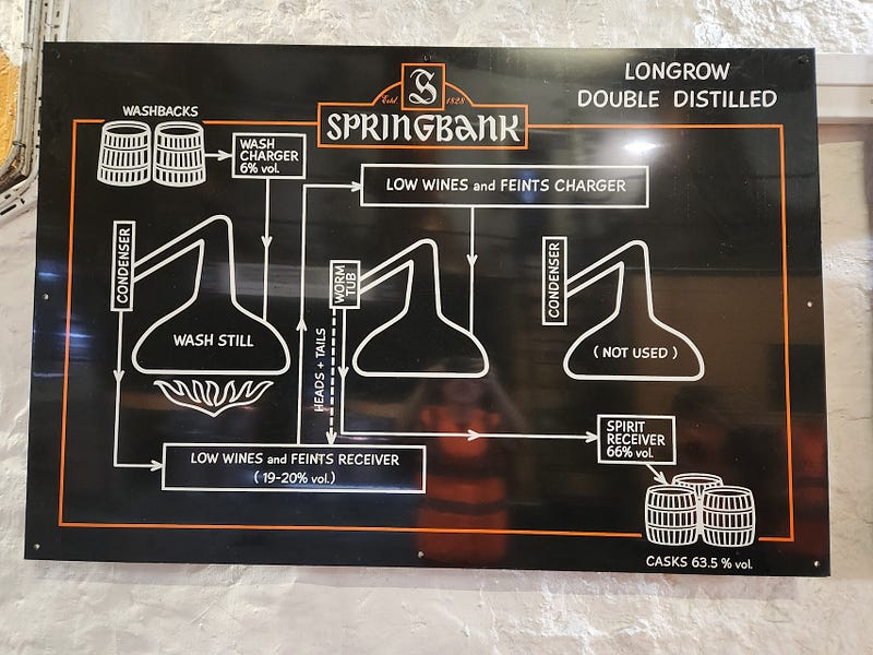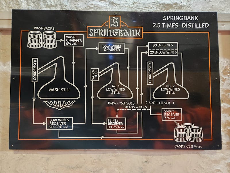 There are different distillation regimes for the three whiskies made at Springbank, which differ in how many times the liquid is distilled and how much peat is used: