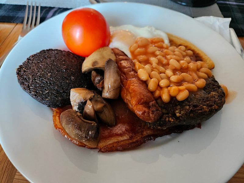On the first day, we were served a Full Scottish Breakfast, which is a fried egg, an edible placemat called a potato scone, black pudding, white sausage, haggis, one or two roast tomatoes, roast mushrooms, bacon, and beans. (Coffee, tea, yogurt, fruit juice, toast, cereal, and fruit were also available.)