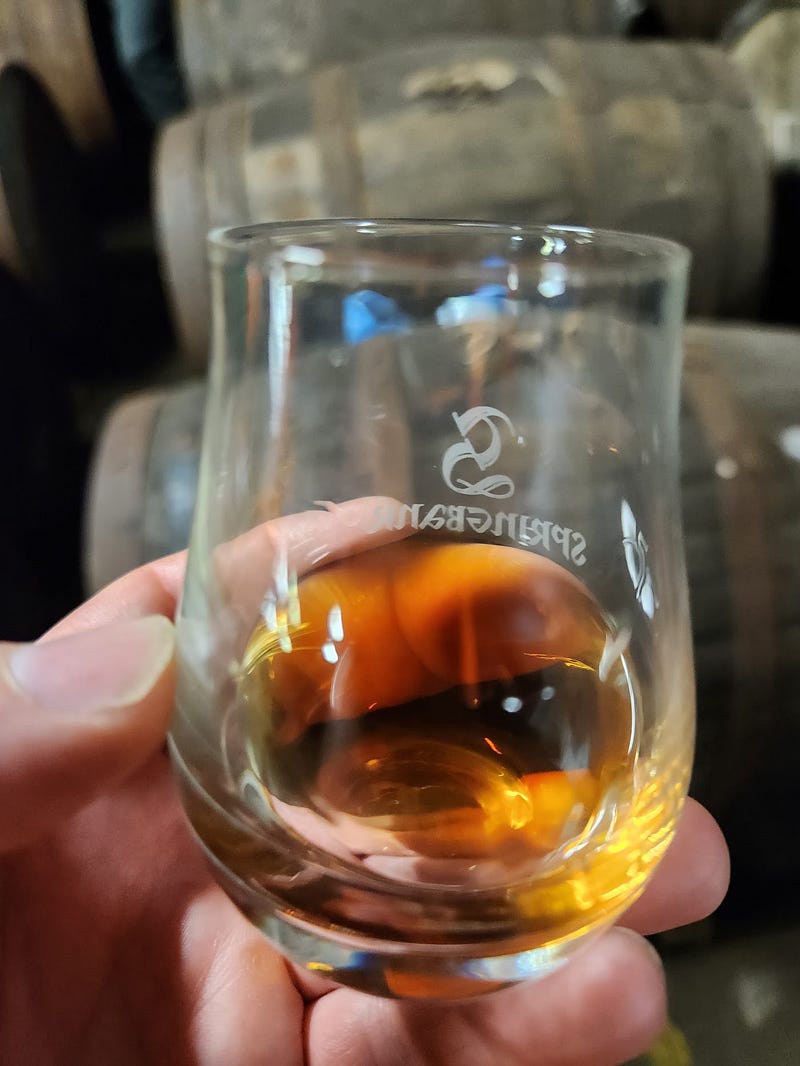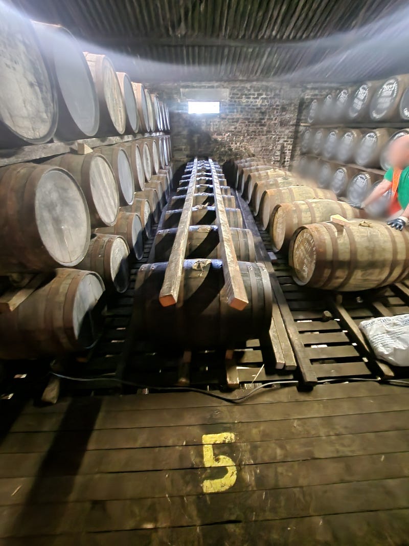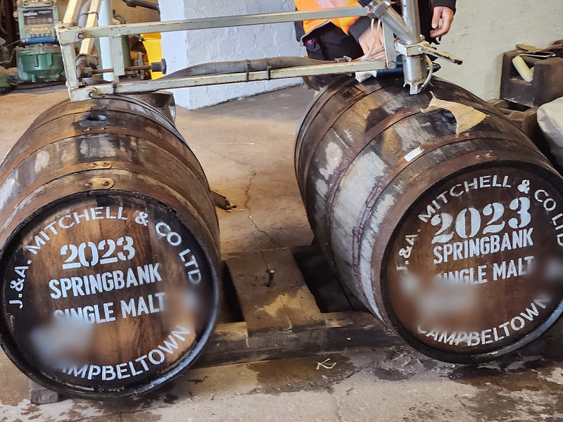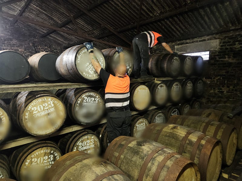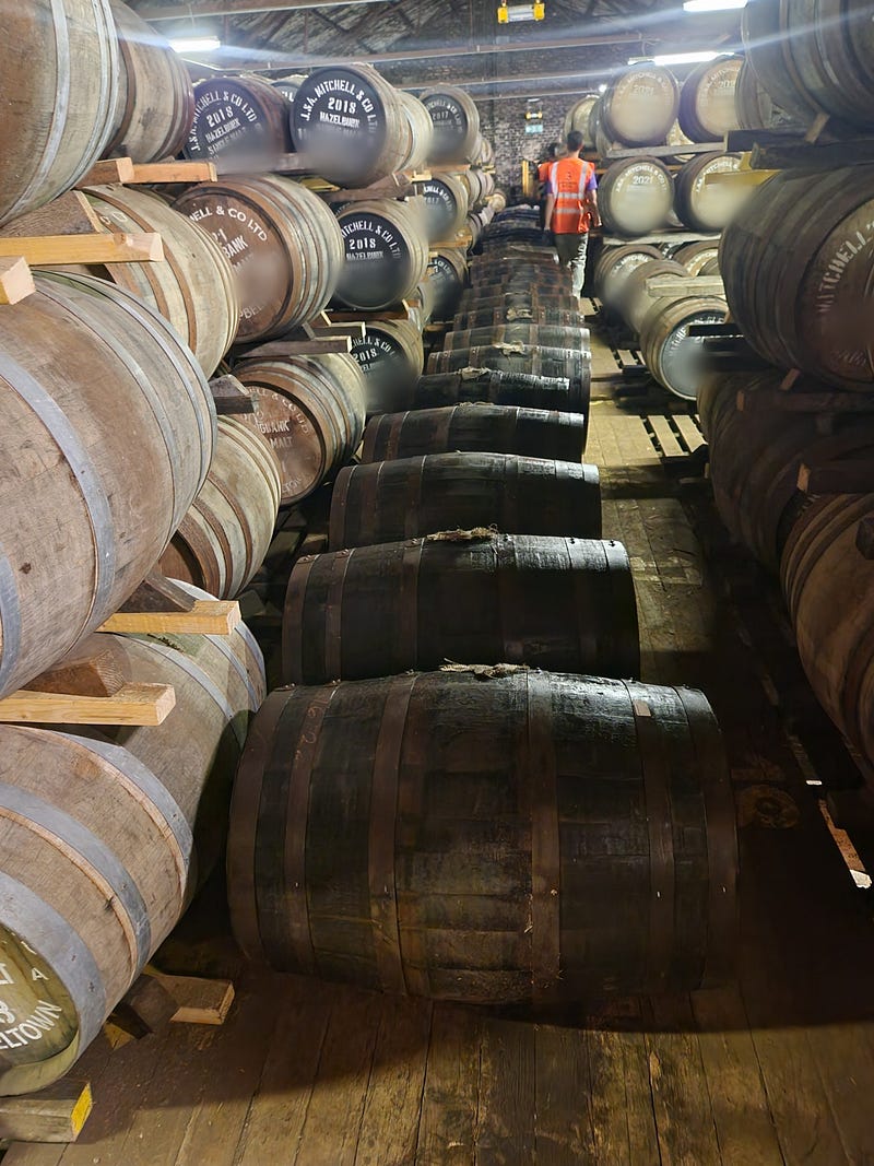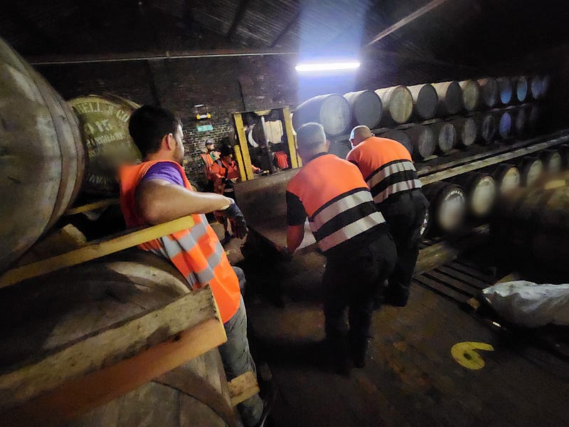I had also been struck by how cheerful the staff were — despite not drinking whisky. Springbank employs a lot more people than Scotch distilleries of comparable size, and many processes that are automated elsewhere are still manual there. Any time we got to see a group of professionals solving problems together, they showed a comfort with each other, a cheerfulness, a sort of mutual trust and appreciation that made me happy to see. This was particularly clear on day 2 when we were rolling casks in at quarter past, twenty-five till, and five till in the dunnage warehouse. And I wondered how much of that happiness and autonomy came from the lack of automation. Did the repetitive nature of their work allowed them to rely on one another, and improvise?
