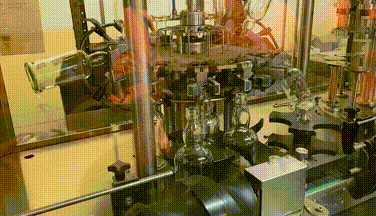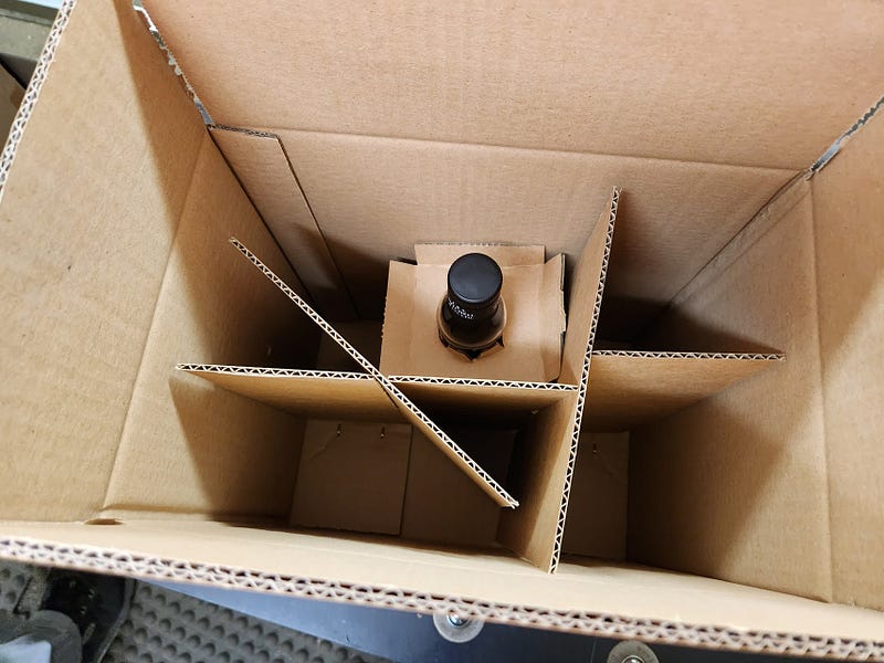 On the front of the line, someone stacks empty bottles onto a conveyor belt. They roll into a machine that cleans them, fills them, puts in a cork, slides foil around the cork, crimps the foil, and attaches a label. Then they come out on a conveyor belt and hit the human assembly line.