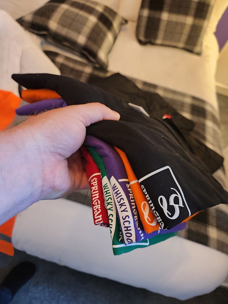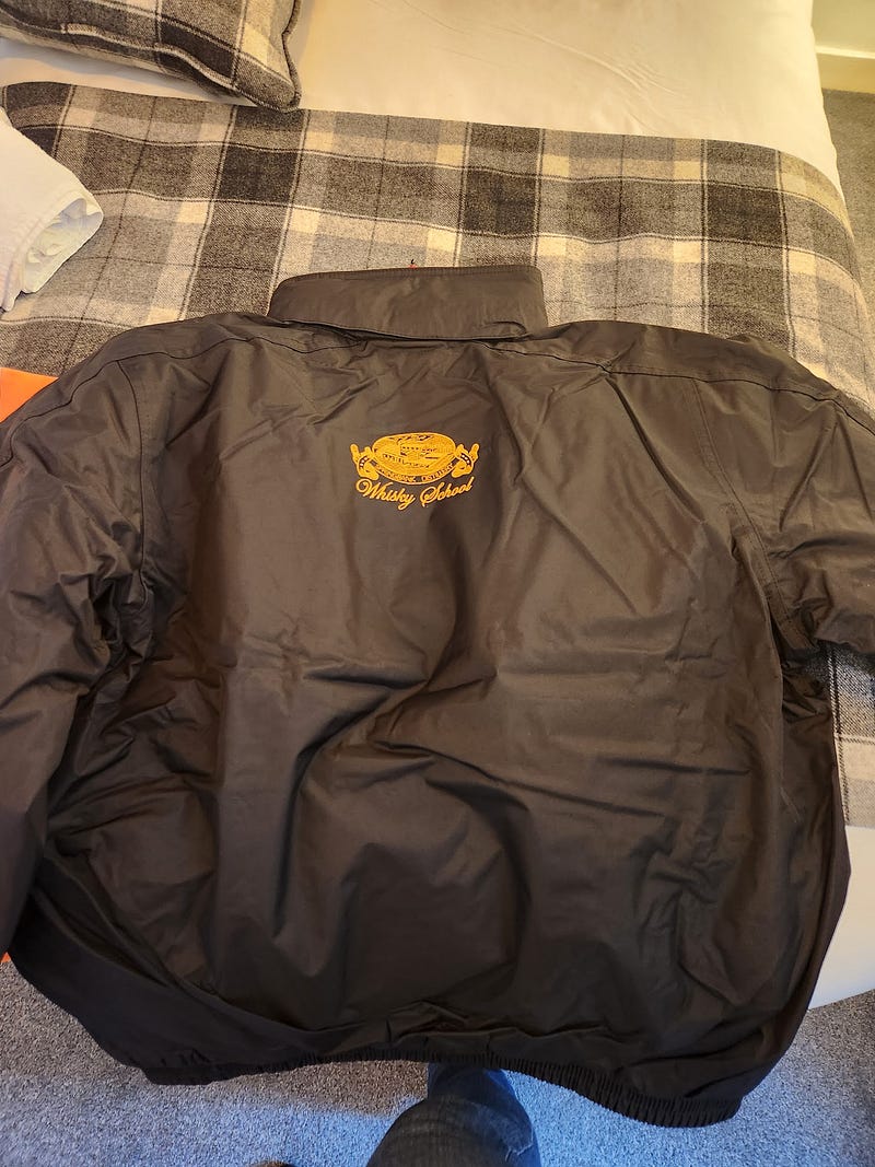 I let myself into the guesthouse. There was a list with the names of six students and the names of our rooms, like “Local Barley” and “Springbank 18.” I went up to my room (Springbank 18), and was pleased to see a spiral-bound “Springbank Whisky School” textbook, a stack of five t-shirts, a heavy jacket, and a high-visibility orange vest, all branded with “Springbank” and/or “Whisky School.” (Mostly pleased. I didn’t need the bulky jacket, and I would rather have had that space in my suitcase for bottles of whisky.)