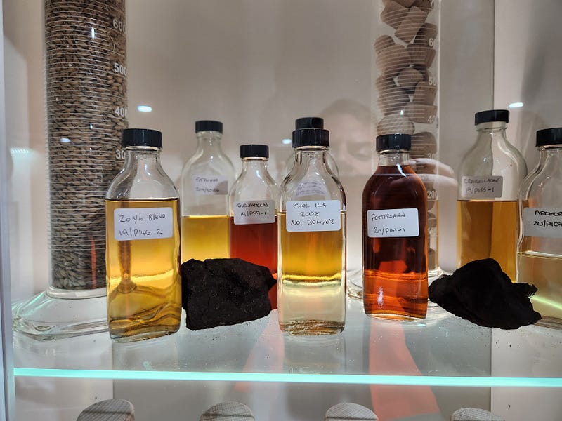 Finally, we went to the blending lab. A bottle can be called a single malt even if it contains samples from multiple casks, of multiple styles, so long as they’re all from the same distillery. We had six large bottles containing the contents of six different styles of casks, and test tubes with samples from those bottles, and beakers and syringes.