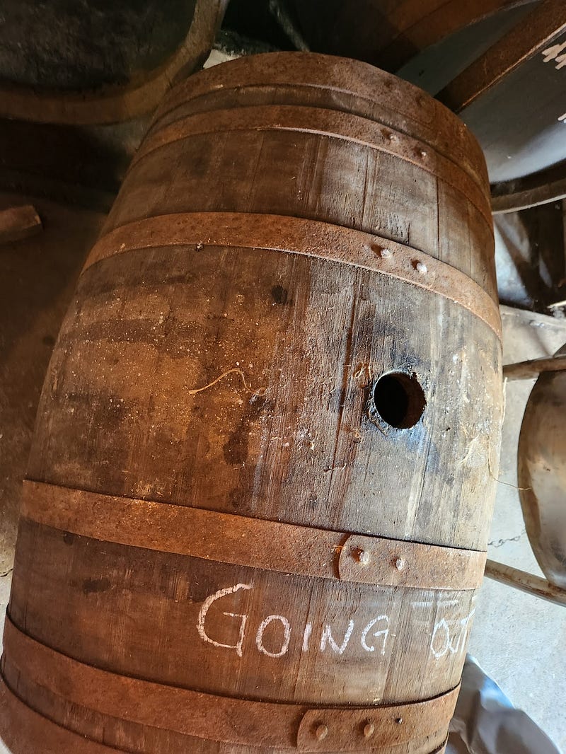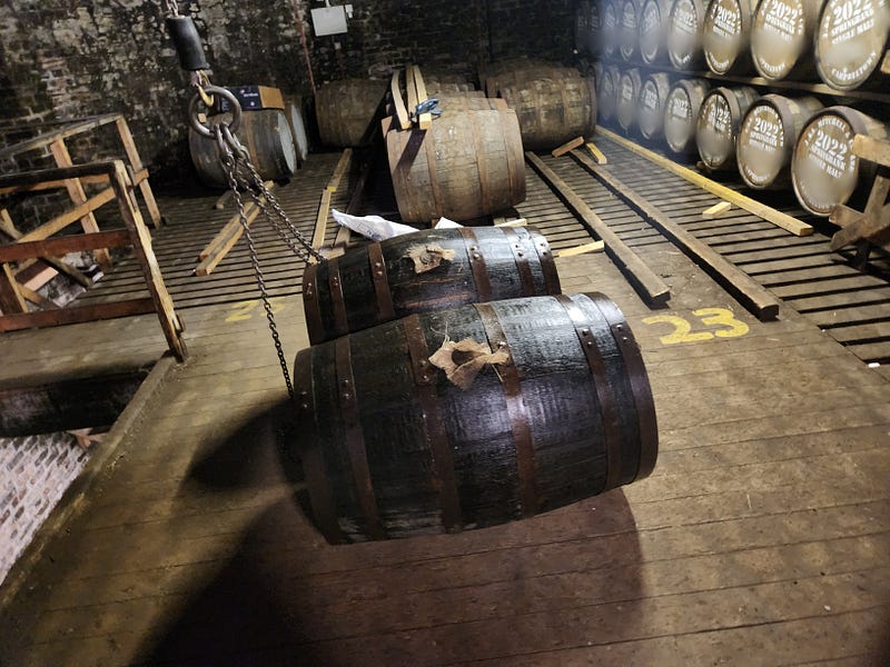 At one point I was moving a cask forward in the warehouse line in little rolling arcs and it got away from me, a little, and crashed into the wall of the office. It didn’t seem to have done any damage. I looked up and met the eyes of the distillery manager, wearing an expression that I hope conveyed my embarrassment. He held my eyes for a moment and whistled a sort of “close call, don’t do it again” whistle. I did not make that mistake again.