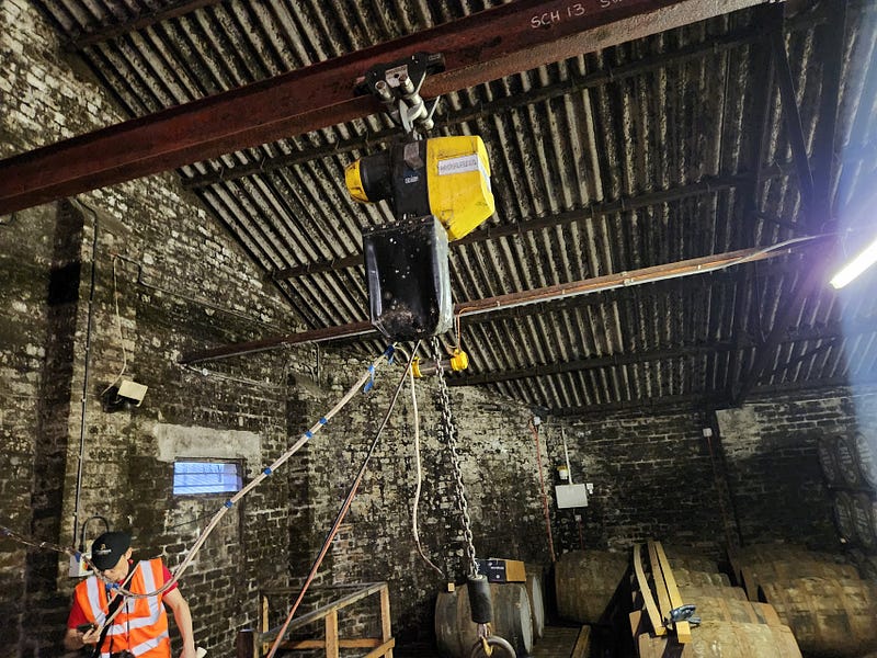 We rolled the casks into place under a hole in the first floor, and used a machine to lower a chain harness. Somebody would hang the chain harness in the proper way around the casks and yell “go!” and we’d lift it up with the “up” button, then pull the machine forward on its rail with a cord, then lower the casks down with the “down” button till they were sitting on the upper floor with the chains loose enough that they could be thrown off by hand, and the casks could then be rolled down the aisle into a line, always retaining the order stenciled on them.