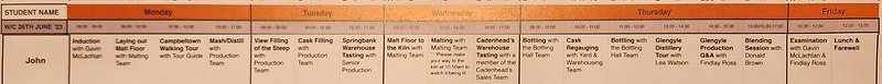 Students spend a week participating in every phase of malt whisky production from one of the last distilleries that does every phase in house, mostly manually.