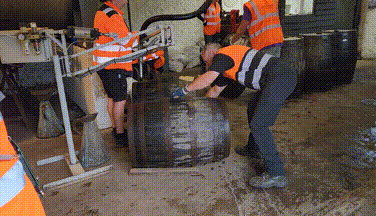 They rolled the first cask up, rotated it so it was facing the correct direction to roll onto the boards, and explained to us how to manage orientation. We wanted to put the cask onto the boards in the correct orientation so that by the time it rolls to the end, it’d be bung up.