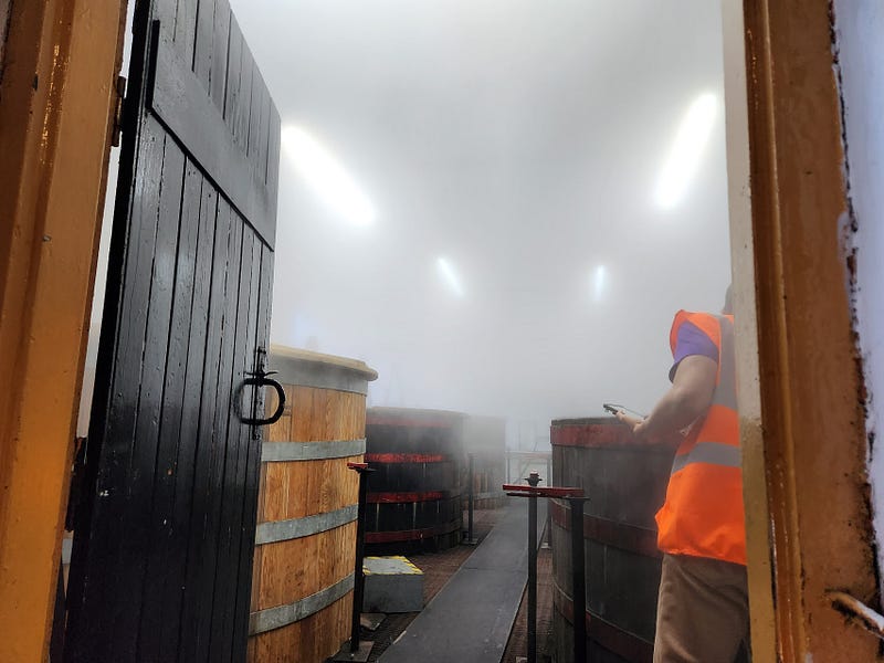 We stopped by the stillhouse, where some steam-cleaning was going on. Upstairs, the washback room was so full of steam it was just a wall of white when we opened the door.