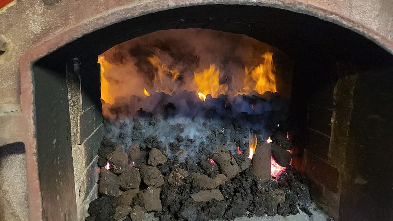 We then watched the firing of the kiln. They were making a batch of Springbank, which starts with six hours of peat smoke followed by thirty hours of hot air, so the guy was going to be stuck there with his shovel for quite a while — though not as long as Longrow, which can take up to six consecutive eight-hour shifts! There are piles of both dry and wet peat; the dry peat is used to get the fire going, but the wet peat generates more smoke, which imparts more flavor.