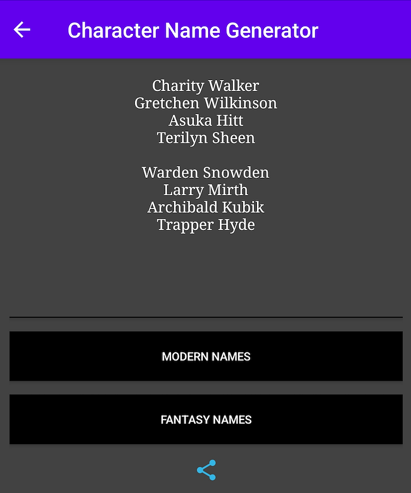 I have an app on my phone — I won’t bother to give you the name, as it doesn’t appear to exist on the Play Store anymore, but there are lots of websites that can do the same thing: churn out randomly generated names, based on existing sources like census data or baby name books. Every day I’d sit down, figure out my story, churn up four or five names that might fit the story, and then use one or two of them. I don’t feel too bad about this — real names aren’t exactly random, but they’re not allocated to us based on what kind of adventures we’re going to have.