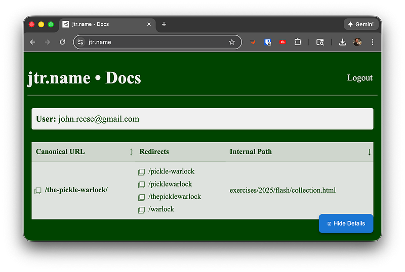 Then (actually, I did most of this after November) I wandered off and coded up a 5kloc content-management system in Go, which runs on Google Cloud Run, automatically rebuilds and redeploys whenever I change any story content, authenticates users via OAuth (“sign in with Google”), and has per-document access controls and mechanisms to request, approve, deny, and share access. Which is a lot of words for “a website where I can permit specific people to read my stories.”