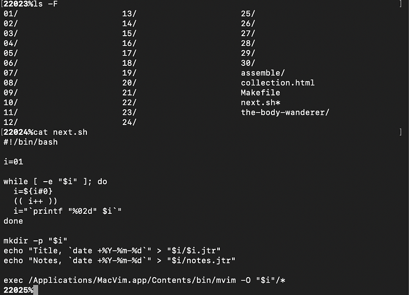 I wrote a little script called “next.sh”, which I would run as soon as I was ready to start a new story; it would look to see what the number of the last story was and create a subdirectory for the next numbered story, with boilerplate for the new story and new notes file.